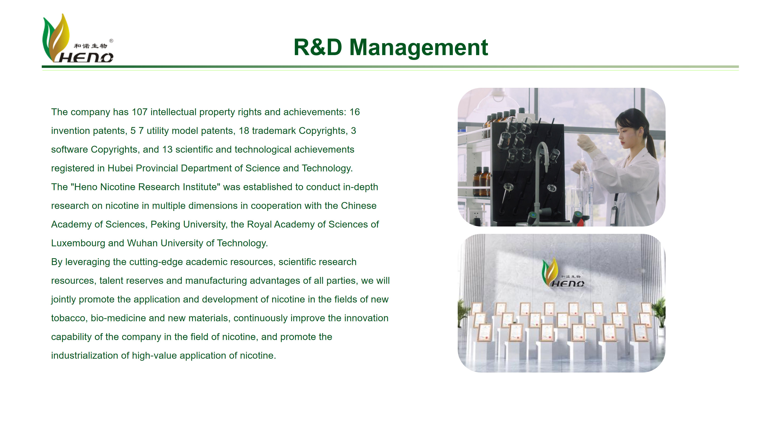 Założona w 2011 roku firma Hubei HENO Bio-Engineering Co., Ltd. jest wiodącym przedsiębiorstwo w Chinach, specjalizujące się w technologii i zasobach obiegowe wykorzystanie odpadów tytoniowych. Po 14 latach zaangażowania rozwoju, zostaliśmy uznani za Przedsiębiorstwo Krajowe „Mały Gigant” (prestiżowe wyróżnienie dla wysoce wyspecjalizowanych i innowacyjnych MŚP), Przedsiębiorstwo Krajowe o Przewadze Własności Intelektualnej oraz Prowincjonalna Zielona Fabryka. Posiadamy 107 praw własności intelektualnej, w tym 16 patentów na wynalazki. Nasza marka „HENO Bio” jest zarejestrowana w w wielu krajach i jest uznawany za znak towarowy Hubei Superior Trademark.